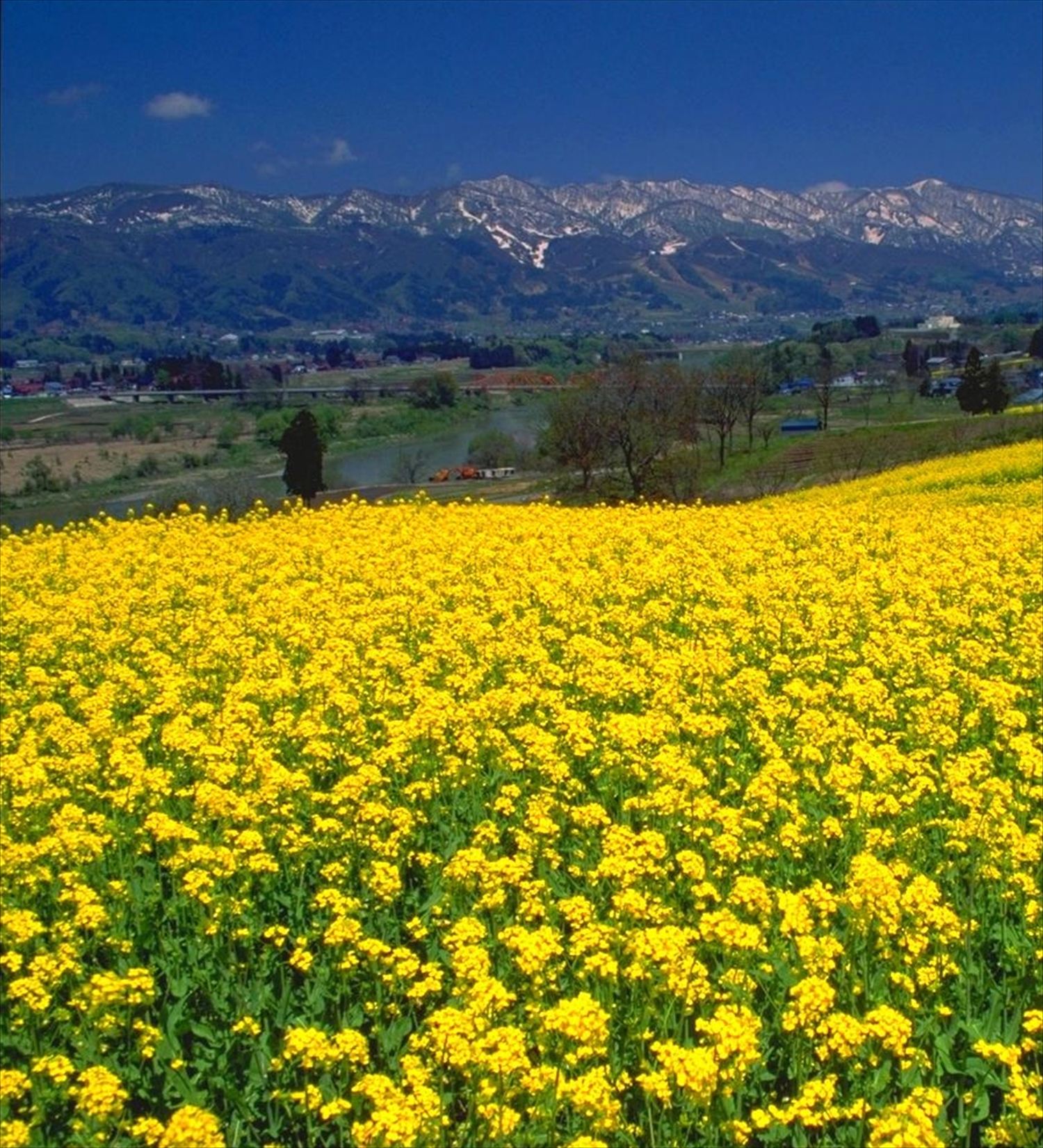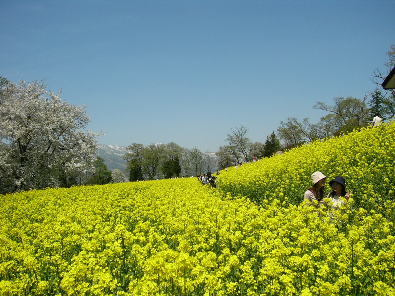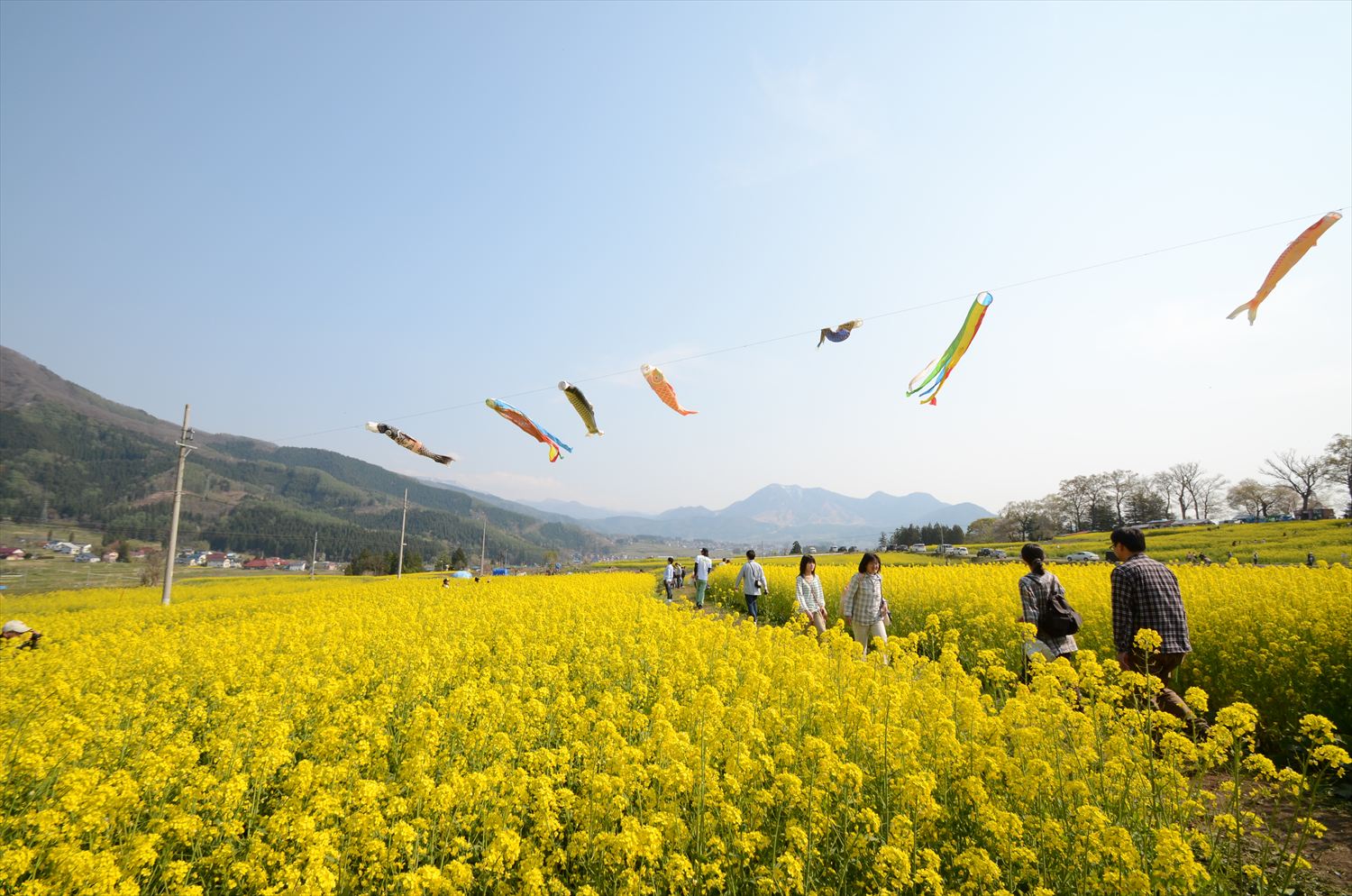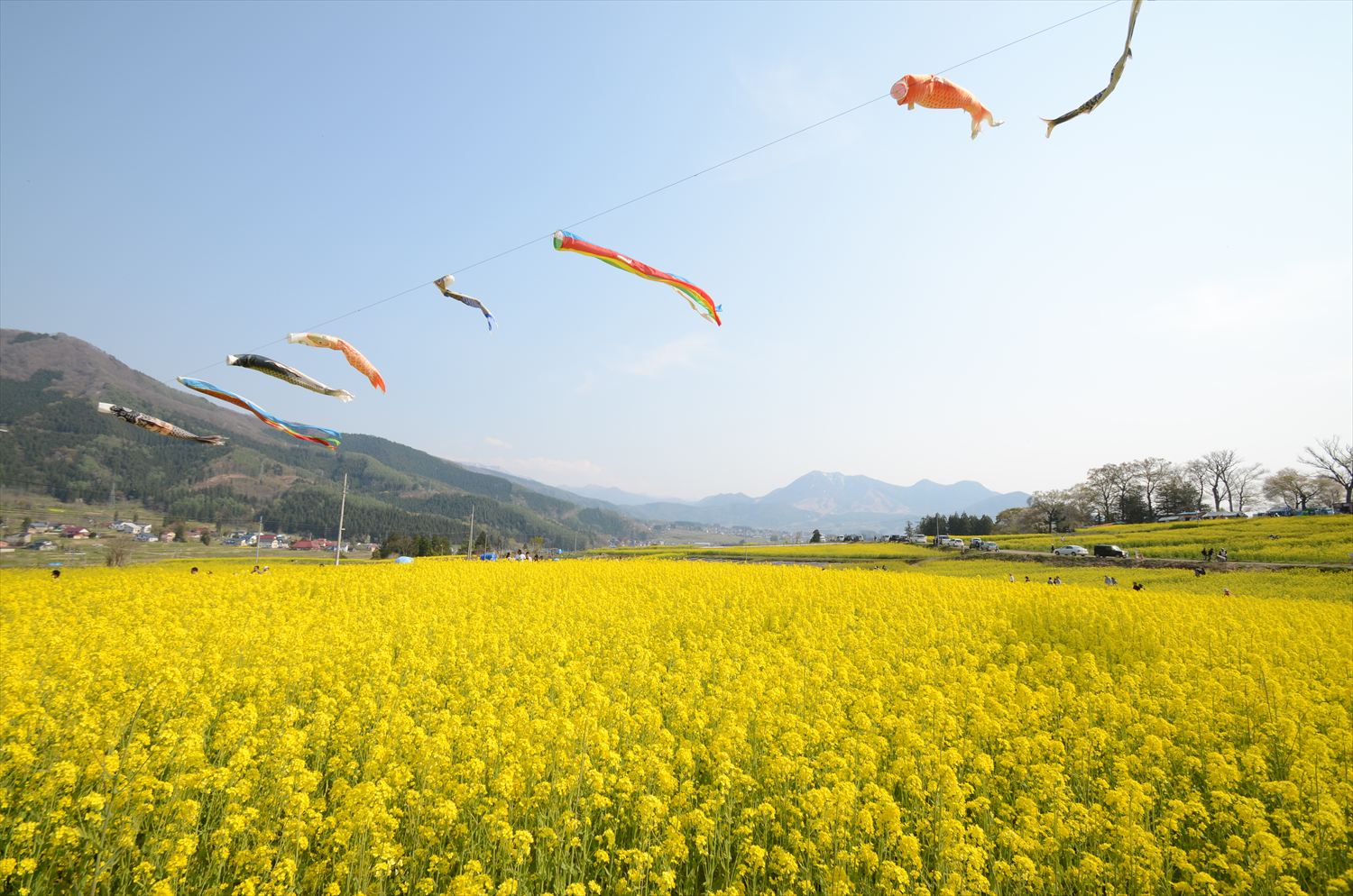 見わたす限りいちめんが菜の花の鮮やかな黄色で覆われる菜の花公園は、いいやま菜の花まつりのメイン会場として会期中はさまざまなイベントが行われます。