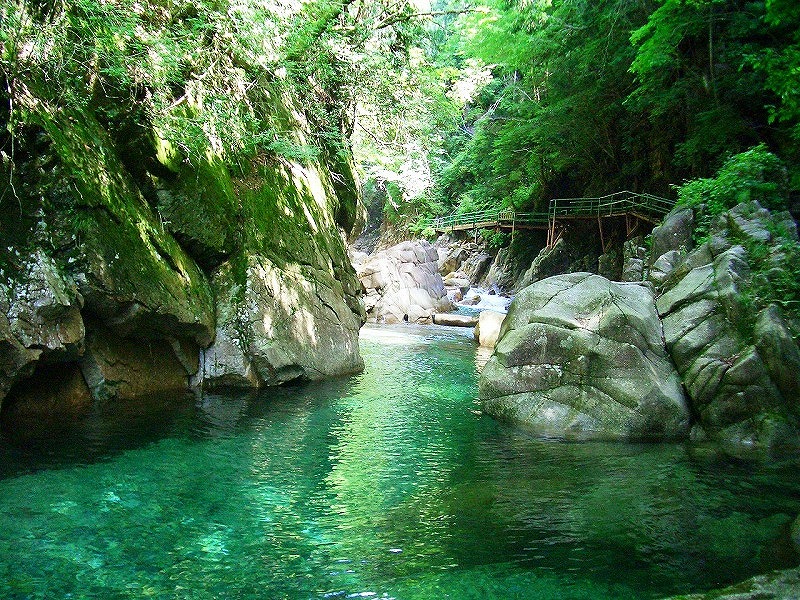 柿其(かきぞれ)渓谷は数ある木曽路の渓谷の中でも特に美しいと言われる滝や瀬や淵を織りなす景勝地です。春にはツツジ・シャクナゲ、秋には紅葉が旅人の目を楽しませます。十二兼駅から自然歩道を通って、牛ヶ滝まで4.5km、さらに奥へは林道を歩いていきます。特に、恋路のつり橋から牛ヶ滝までの約300mの遊歩道がお勧めです。