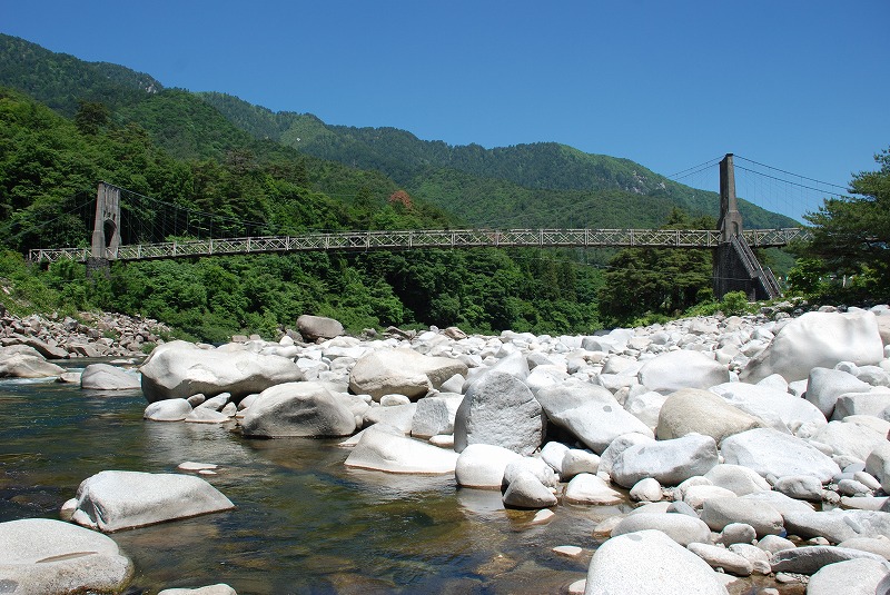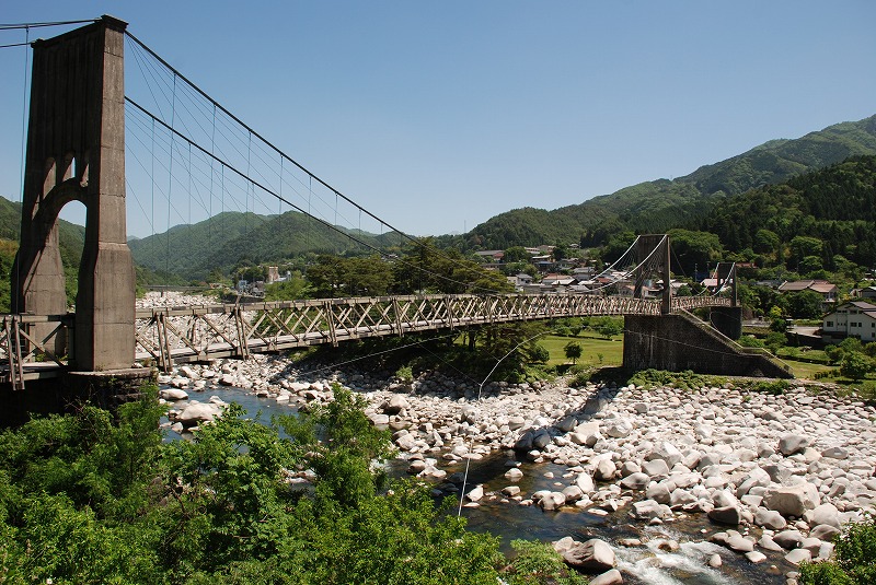 これは、木曽川の水力発電開発に力を注いだ福沢桃介(大同電力社長)が、読書(よみかき)発電所(大正12年完成)建設のための資材運搬路として架けたことから、「桃介橋」と呼ばれています。全長247m、幅2.7mで、国内最大級の木製吊橋として知られています。