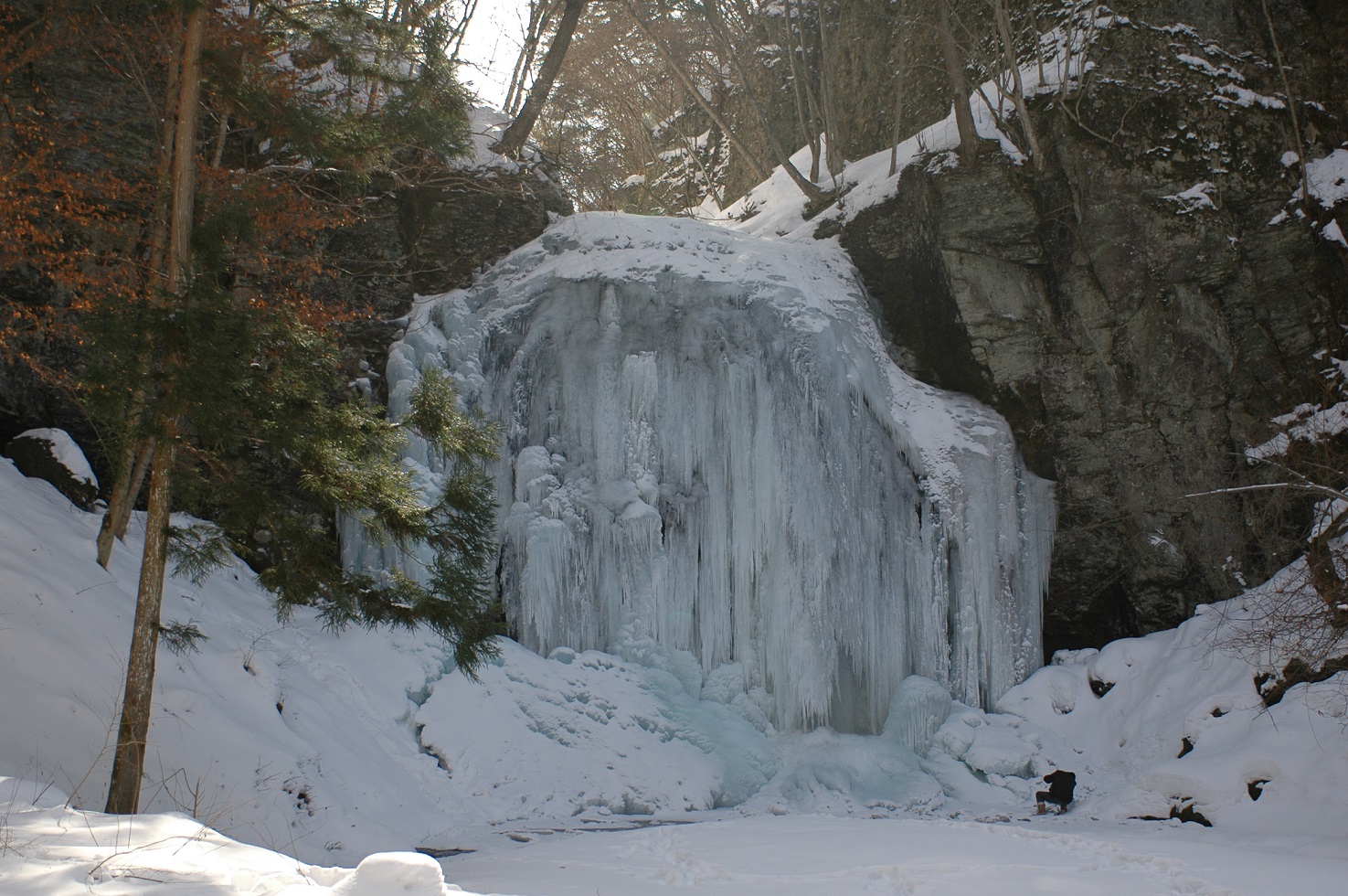 長和町大門地区大沢渓谷の不動滝は、落差16mあり水量は多くはありませんが、レースのカーテンのような清涼感たっぷりの滝です。その昔は修験者が修行した滝と伝承されています。四季折々の変化が素晴らしく、特に寒さが厳しい2月には滝が凍結し、全面結氷した風景を撮影しに多くのカメラマンが訪れます。