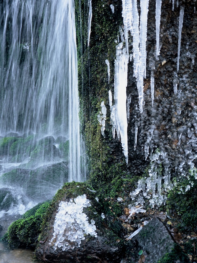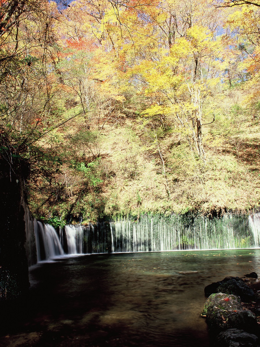 湯川の水源にあるこの滝は、高さ3m、幅70mの岩肌より数百条の地下水が白糸の如く落下し、実に美しい滝です。春は爽やかな新緑に包まれ、夏の季節には滝しぶきと涼風が訪れる方を楽しませ、秋はまばゆいばかりの紅葉を堪能することができます。