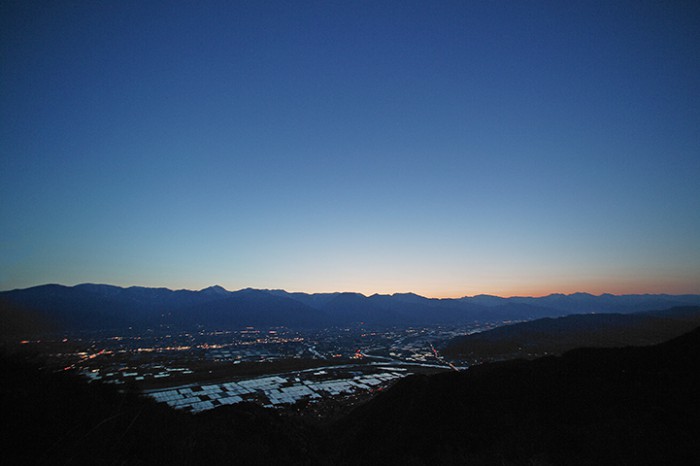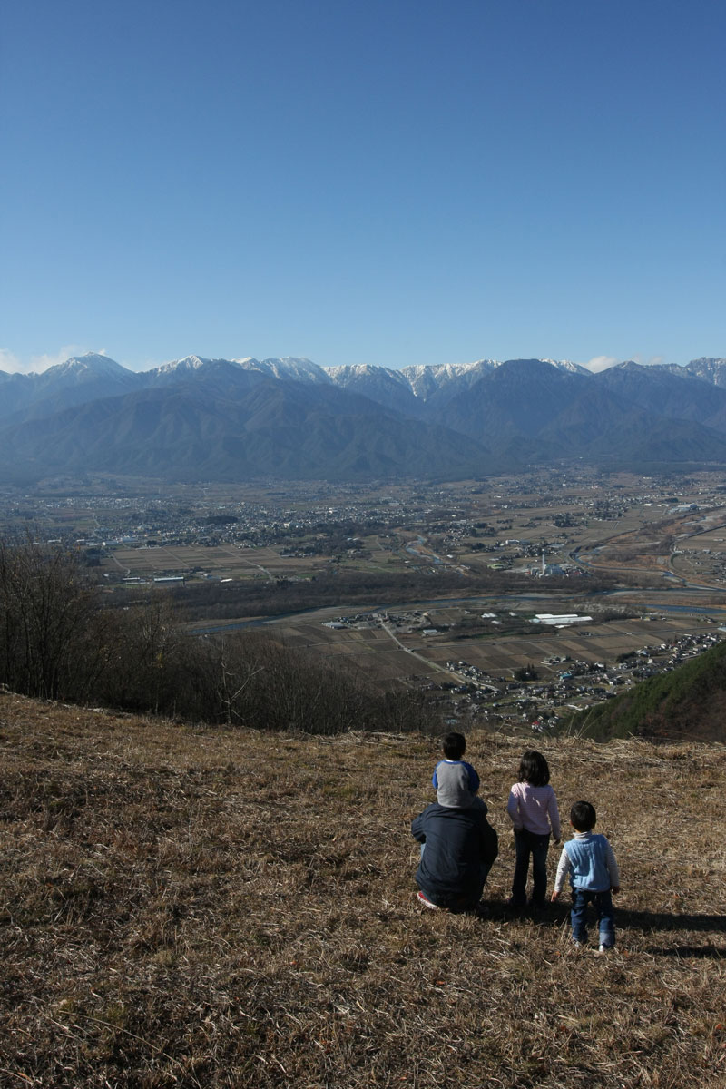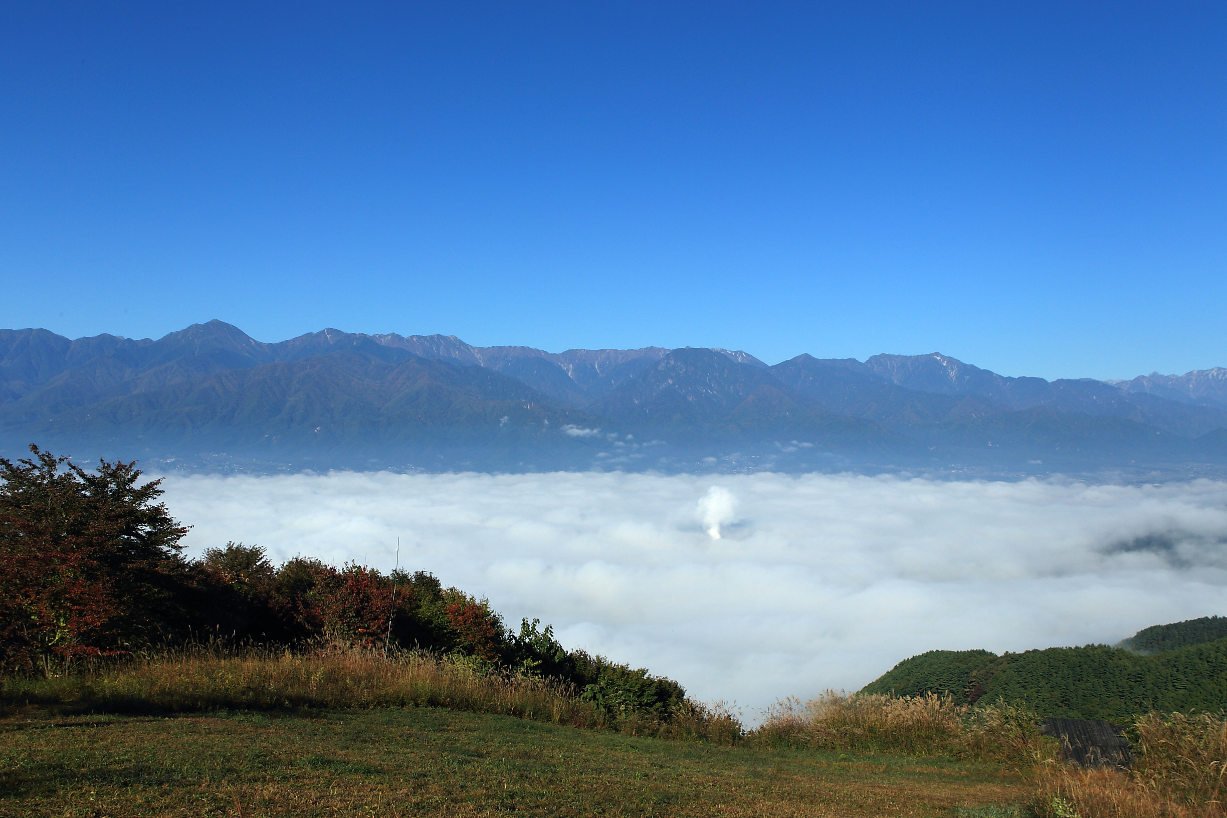 安曇野市の東に位置し、犀川、高瀬川、穂高川の三川合流を眼下に見下せる山。安曇野の田園風景と北アルプスを一望できる絶好のビューポイントとして親しまれています。昭和45年5月に作家の川端康成、井上靖、日本画家の東山魁夷が一同に訪れ、この地からの眺めを「残したい静けさ、美しさ。」と絶賛しました。