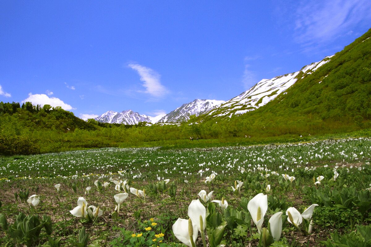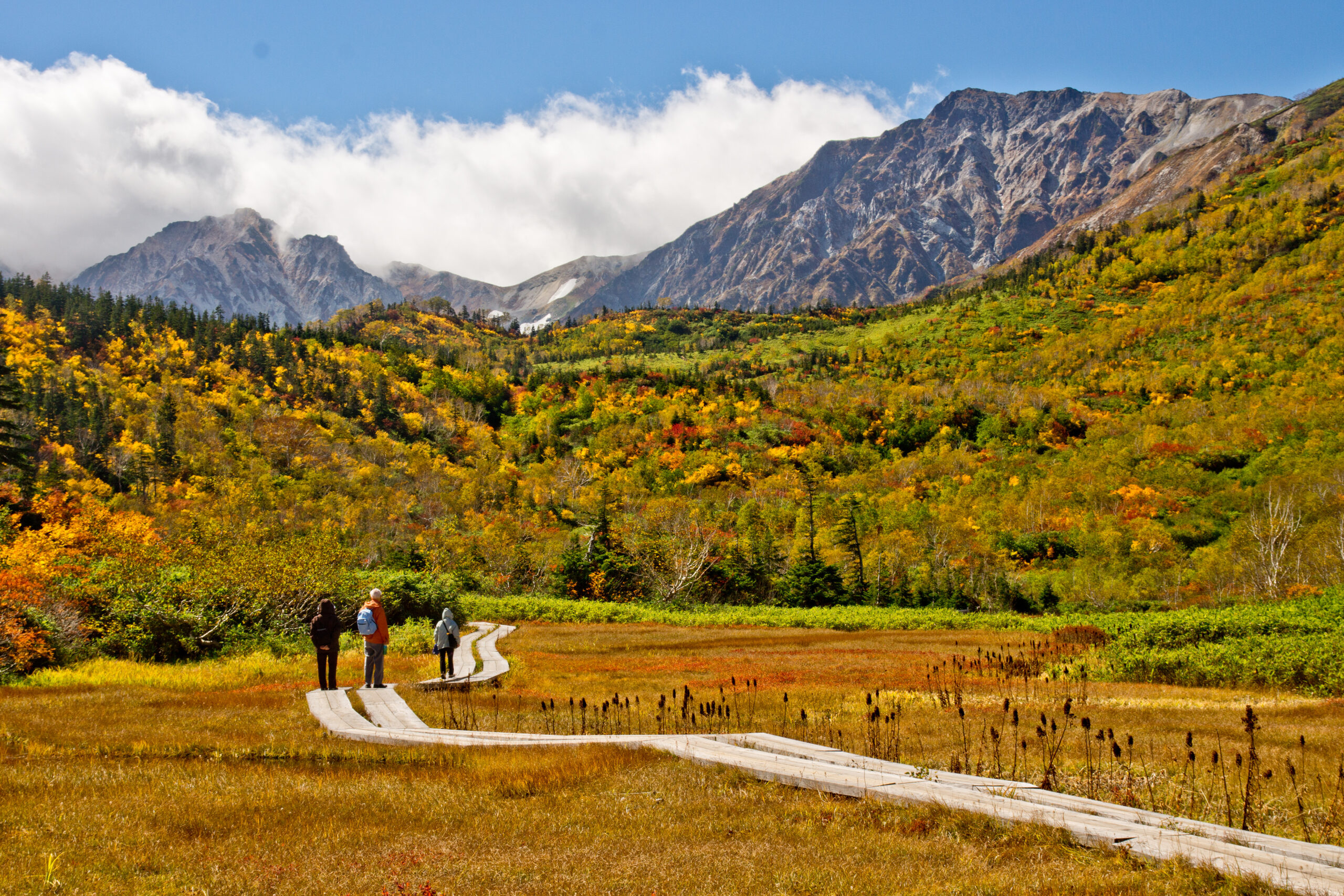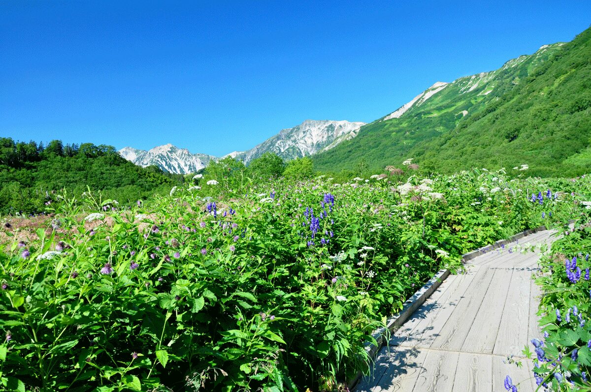 6月中旬から8月下旬には、北アルプスの景色と可憐な高山植物の花々、9月下旬から10月中旬は、紅葉が鮮やかに園内を彩ります。