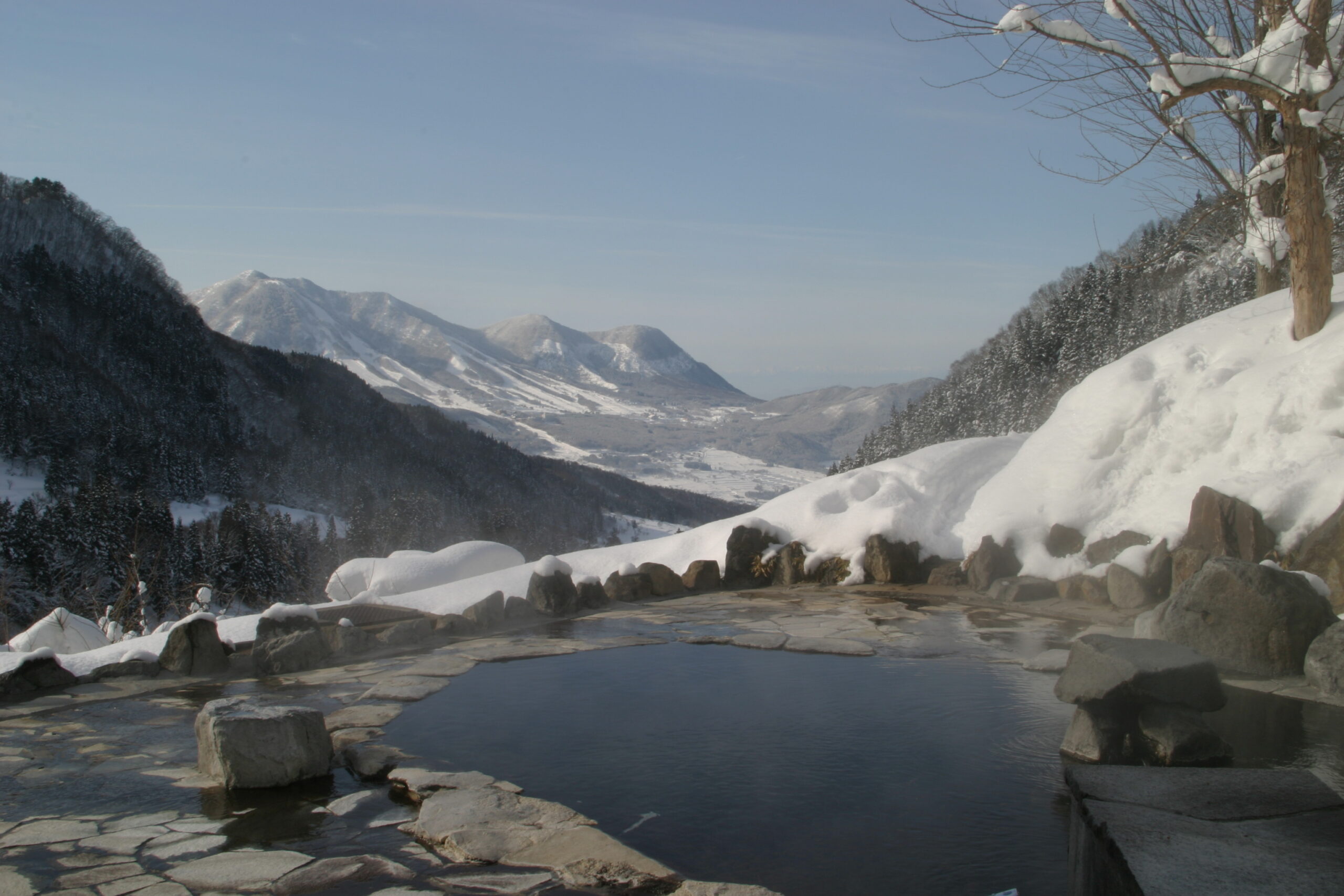 馬曲川沿いの山間部にあり、戦国時代の山城のある山々が見える馬曲温泉からの眺望は、日本経済新聞が選定した『雪景色が素晴らしい温泉』において東日本で一番と評価される通り、山々の雪景色に囲まれた風情ある温泉です。冬景色で評判になった馬曲温泉ですが、四季を通じて景観の良い温泉としての評価もされている温泉です。