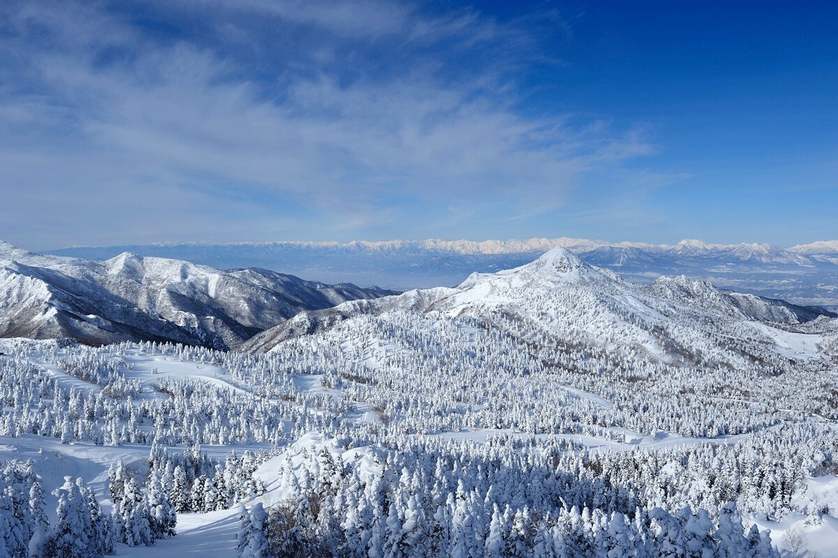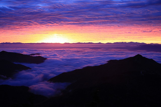 晴れた日は横手山山頂から360度の大パノラマが展開。条件が揃えば富士山から佐渡ヶ島まで見ることができます。また、夕日は雲海と北アルプスのシルエットが黄金にかがやく天空は見るものすべてを魅了します。