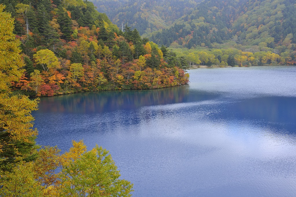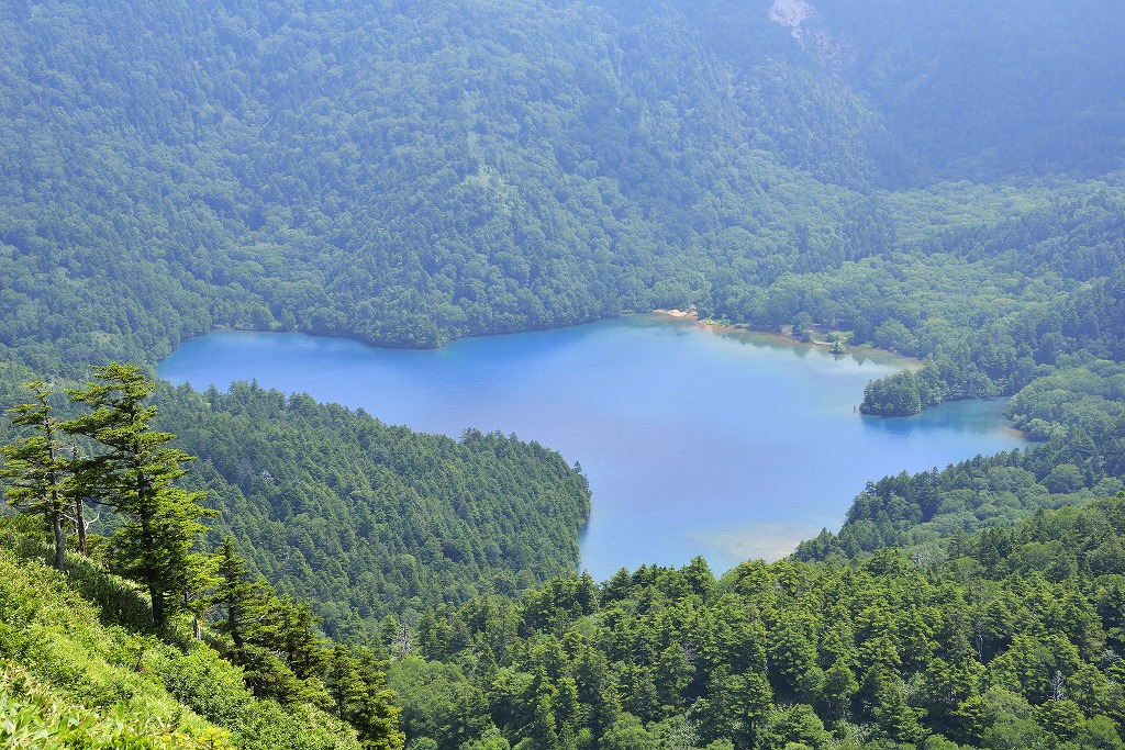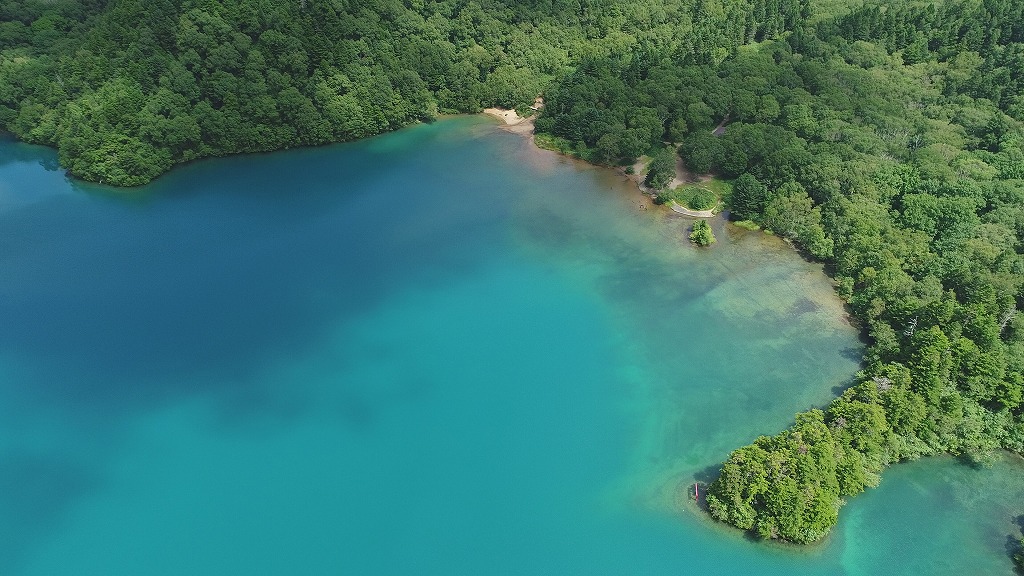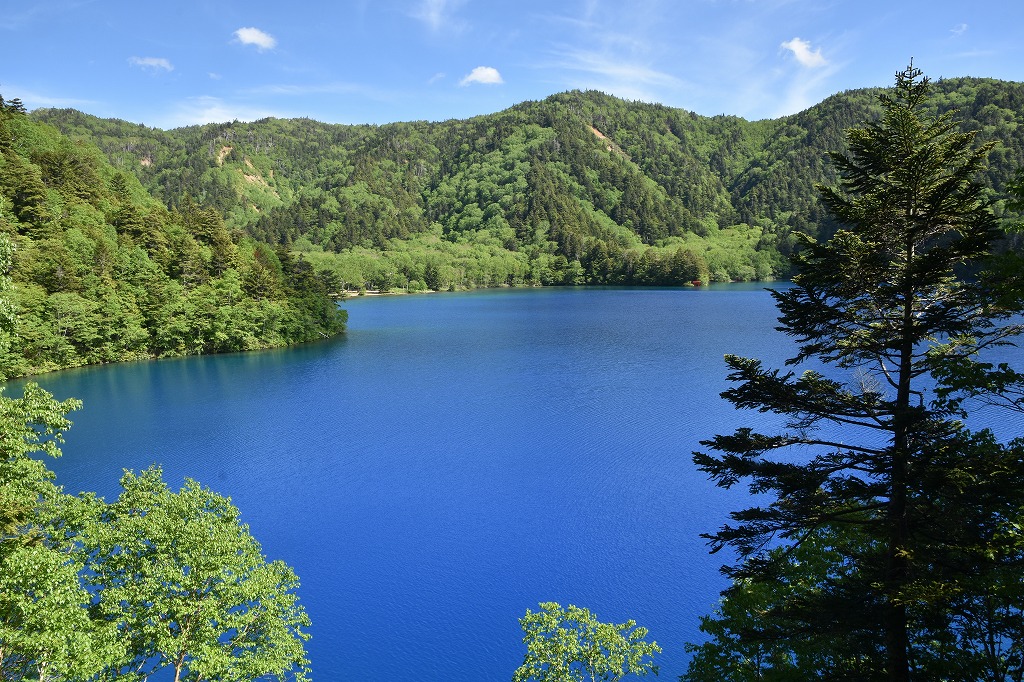 ブルーやエメラルドグリーンに色を変える神秘的で幻想的な池で、朱塗りの鳥居が湖面に浮かび、標高2000mを超える山々が周りを囲みます。水質は多量のアルカリ塩類で塩素、石灰、鉄、硫黄などを含有し生物の繁殖には適さず、全国的にもこの様な水質の湖沼はめずらしい。