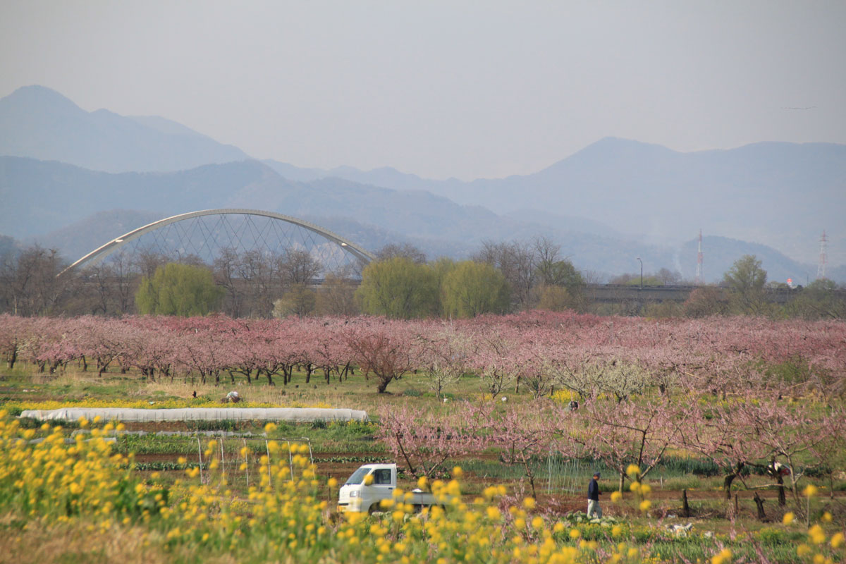 千曲川河川敷内に約24haもの桃畑が広がり、約8000本の桃の木に鮮やかなピンクの花が咲き揃います。そのほか「プラム」の白い花、黄色の「菜の花」、5月上旬には「林檎」の白い花が一面咲き誇ります。