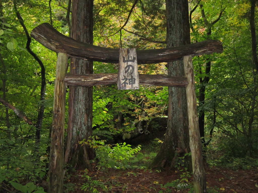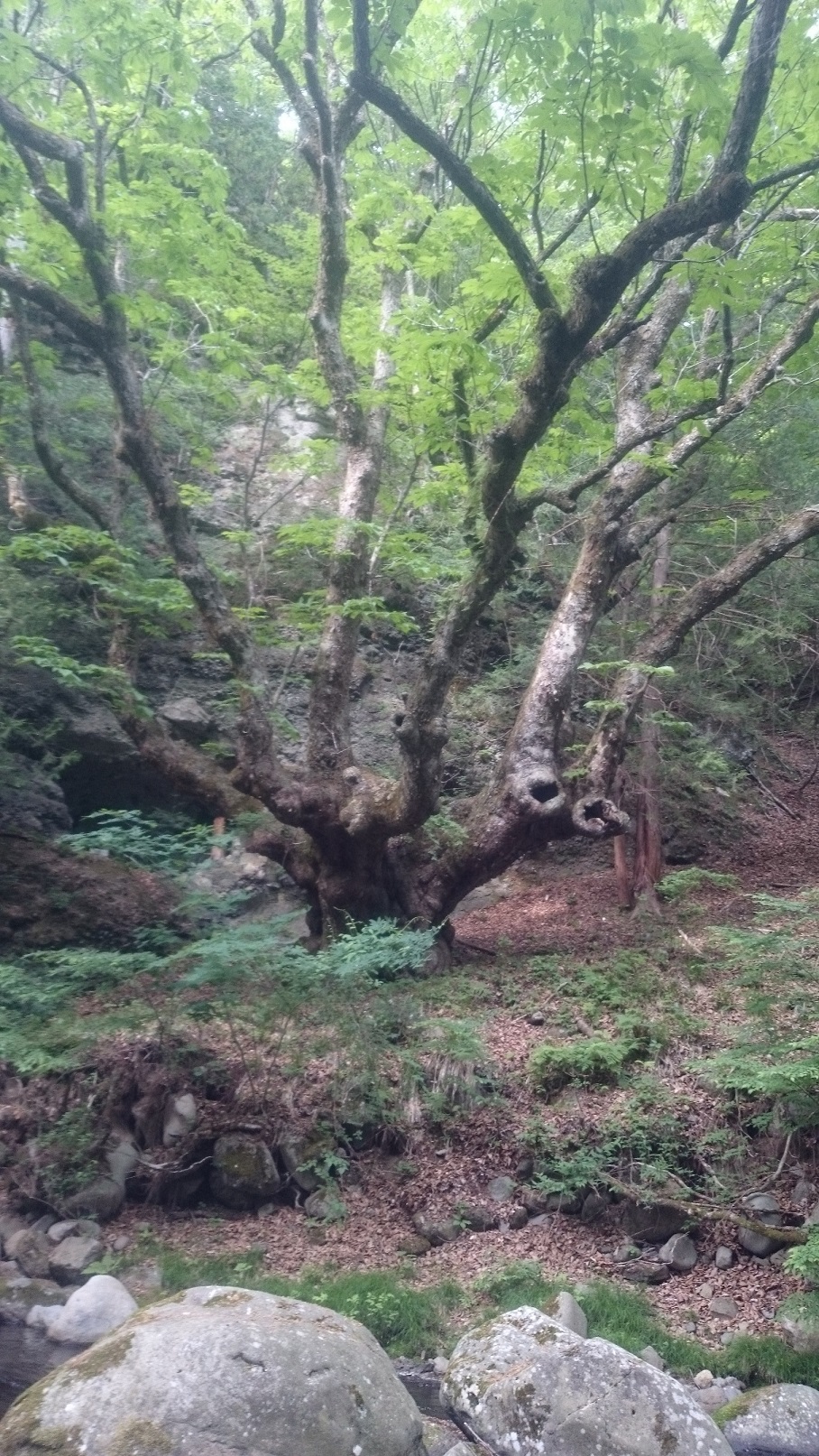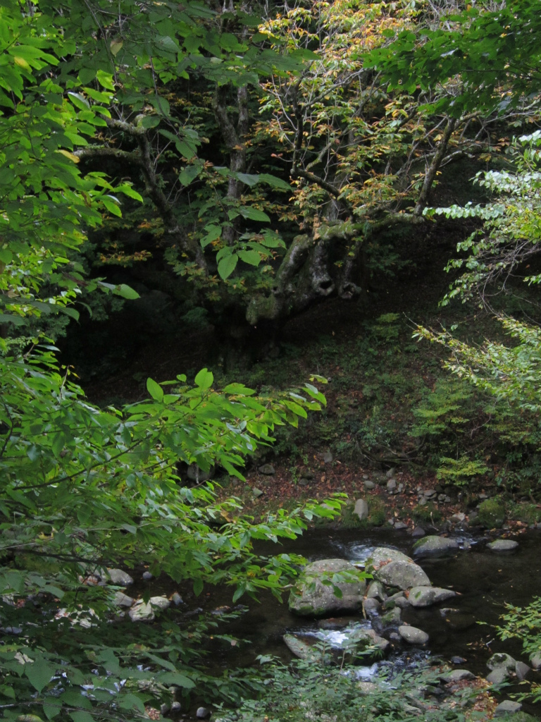 渓谷のシンボルとも言える樹齢500年の栃ノ木は山ノ神の御神木として祀られており、対岸の鳥居から見えるその姿はとても神秘的なものです。