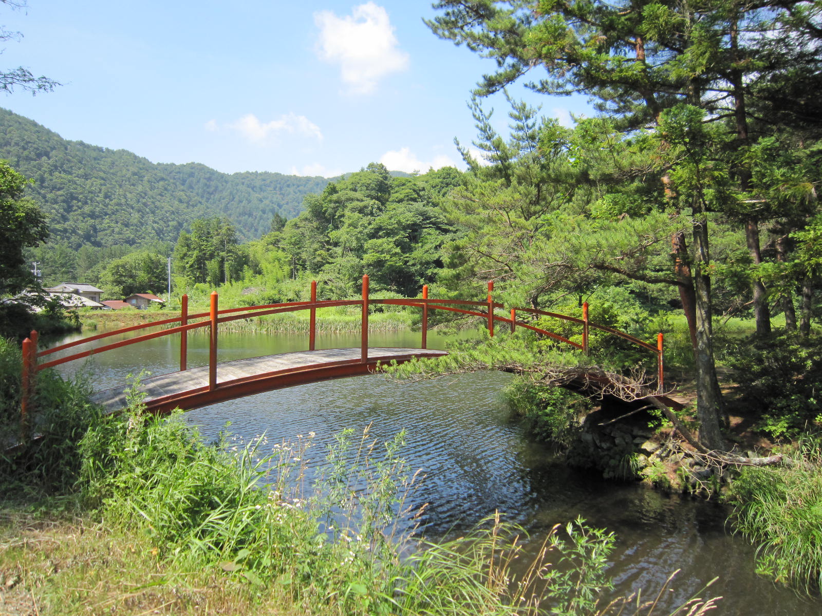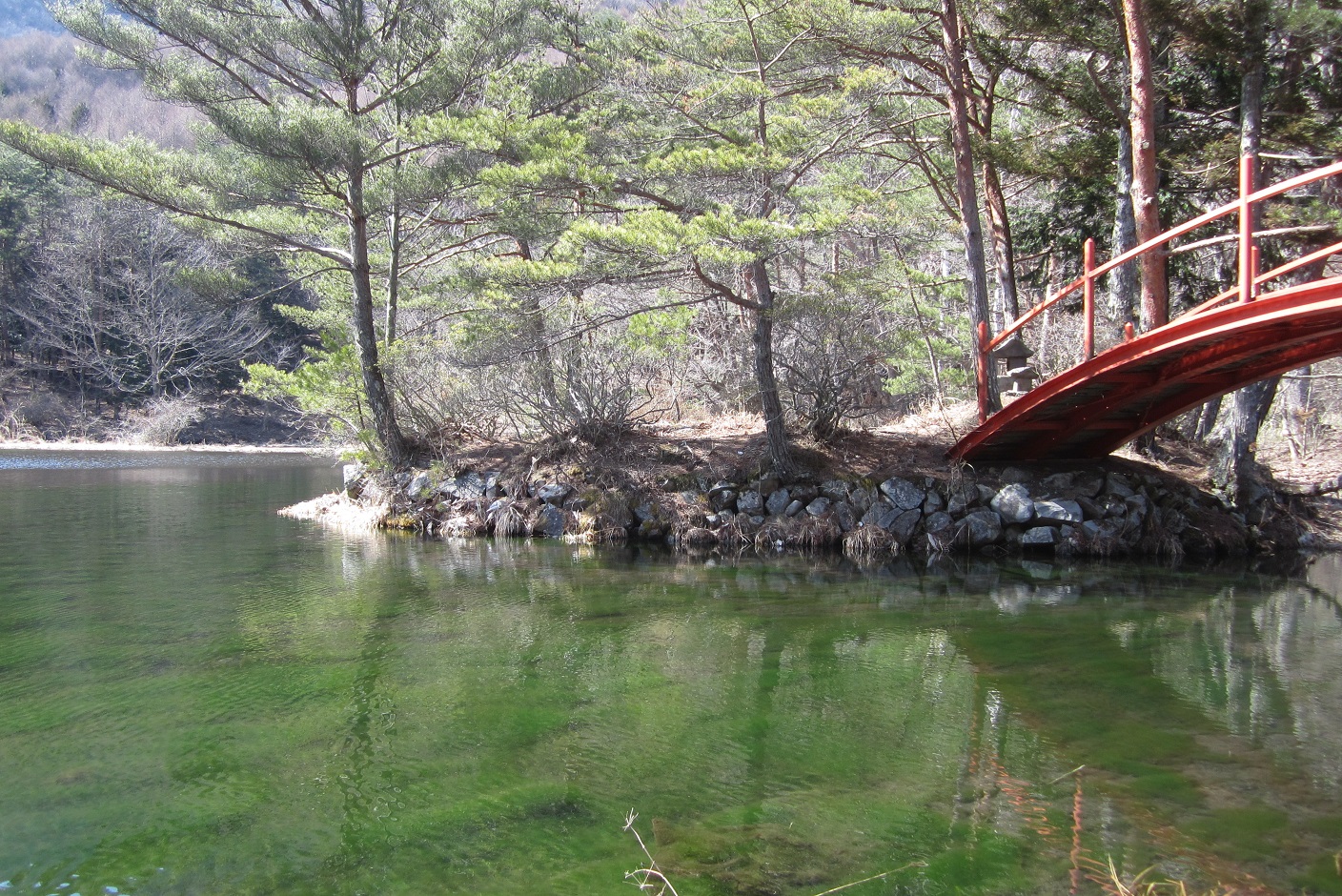 池の中央には直径10メートル程の島が浮かび、岸より橋を渡して島へ渡れるようになっています。