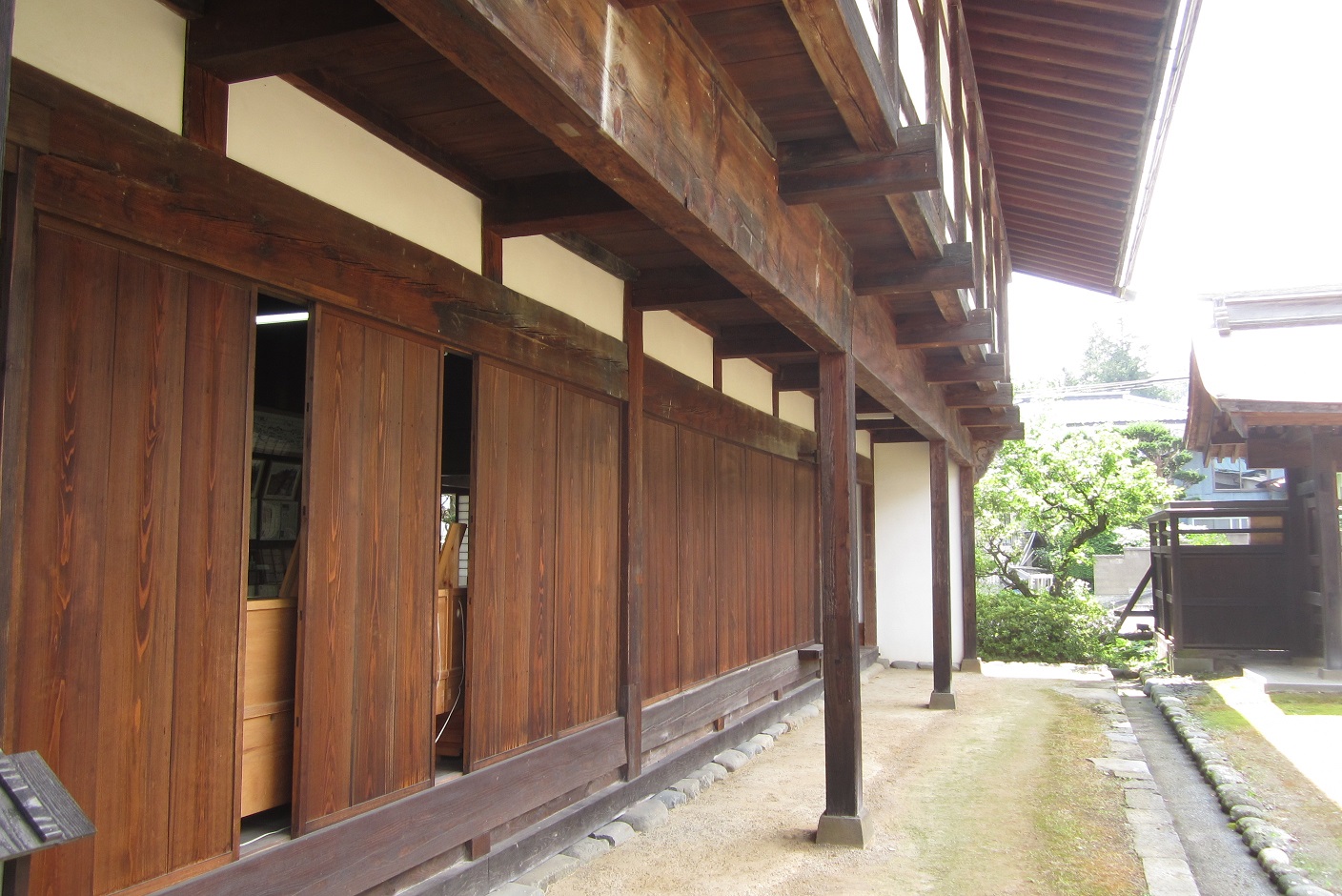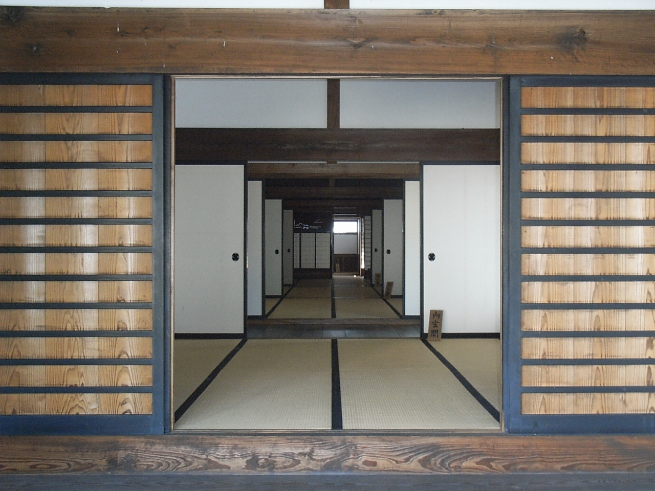 本陣母屋は間口12間、奥行9間、幅1間の出桁造り。1633個もの置き石が乗る栗板葺の屋根は日本一の規模であると推定されます。