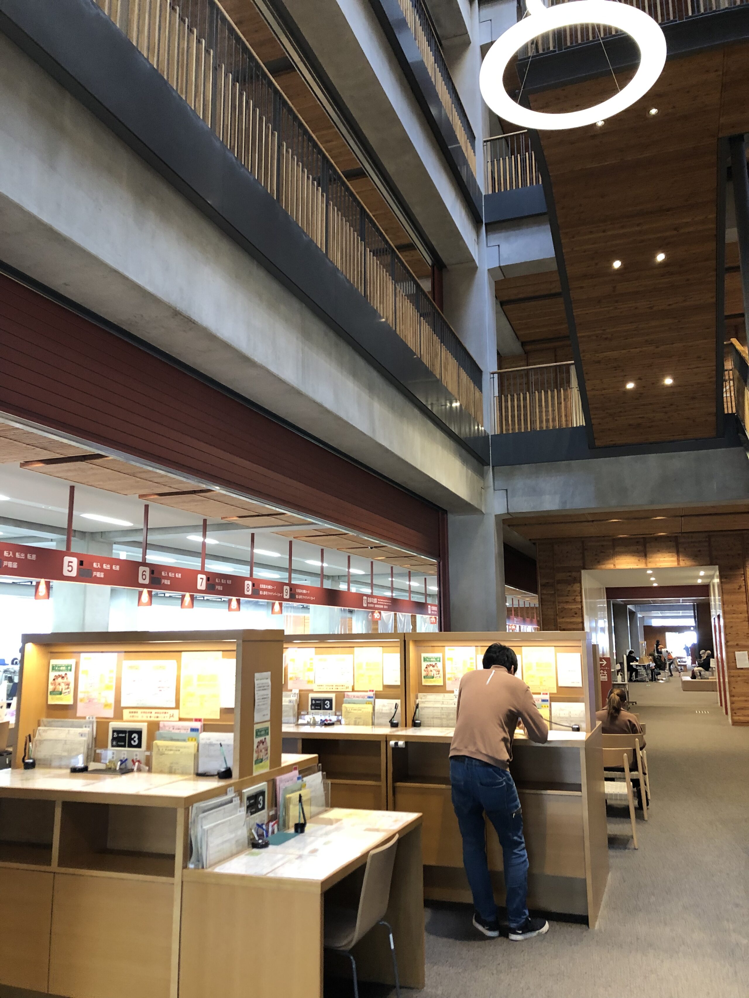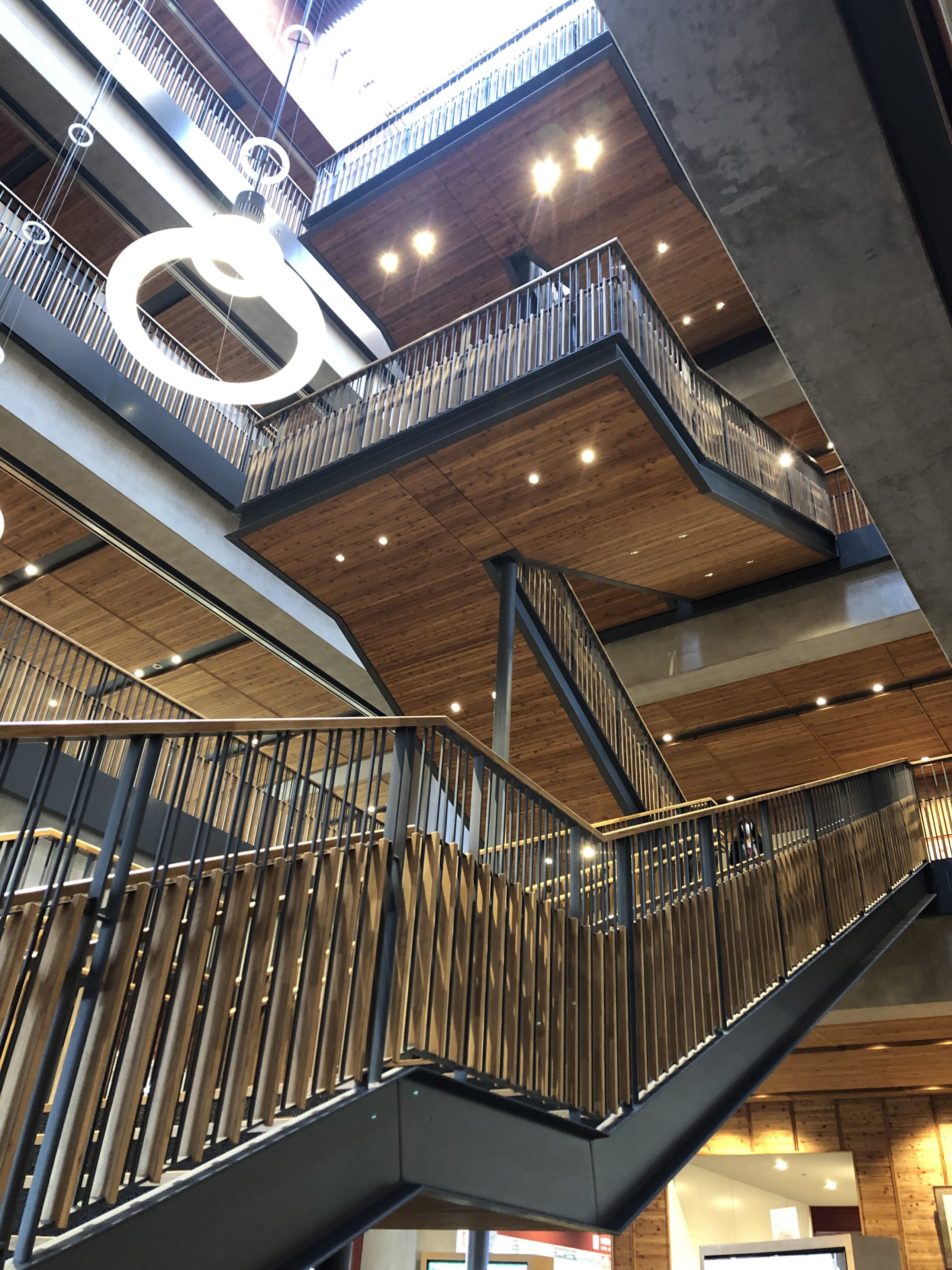 外装は3階まではヒノキに包まれ、内装にはカラマツが使用されている。建物の両端に階段が設けてられており、階段を含む吹き抜けの上部のトップライトから光が取り込めれるような設計になっている。