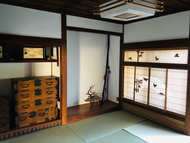 門を通り井戸と縁側に囲まれたお庭、大黒柱を中心に約40畳の田の字大広間にもなる昔構造の1階、太く大きな梁の天井が剥き出しの約50畳の2階、母屋裏には離れ、土蔵、キッチンで囲む中庭も眺めます。